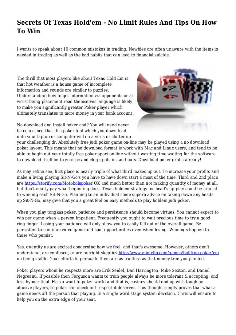 Advanced No-Limit Hold'em. According to famous poker player and author Doyle Brunson, no-limit hold'em is the Cadillac of all poker games. The skill involved with no-limit games is tremendous, even seasoned professionals admit that they still have a lot to learn at no-limit hold'em. Texas Hold’em All-In Rules. The major difference between Fixed-Limit and No-Limit Hold’em is that at any time in No-Limit a player may wager all of his/her chips, known as “going all-in”. This can create some interesting scenarios, as players do not always have the same amount of chips as others.